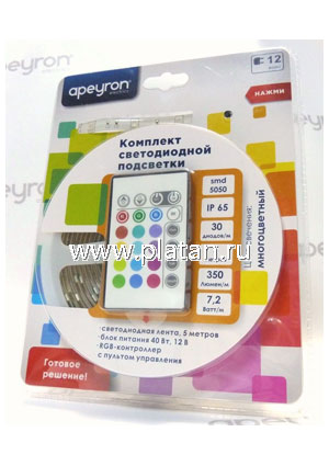 • 10-03, Набор светодиодной ленты 12В, 30SMD(5050)/m, RGB, 5м, IP65, с блоком питания, контроллером, п