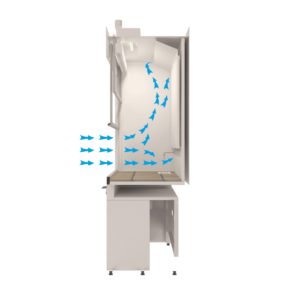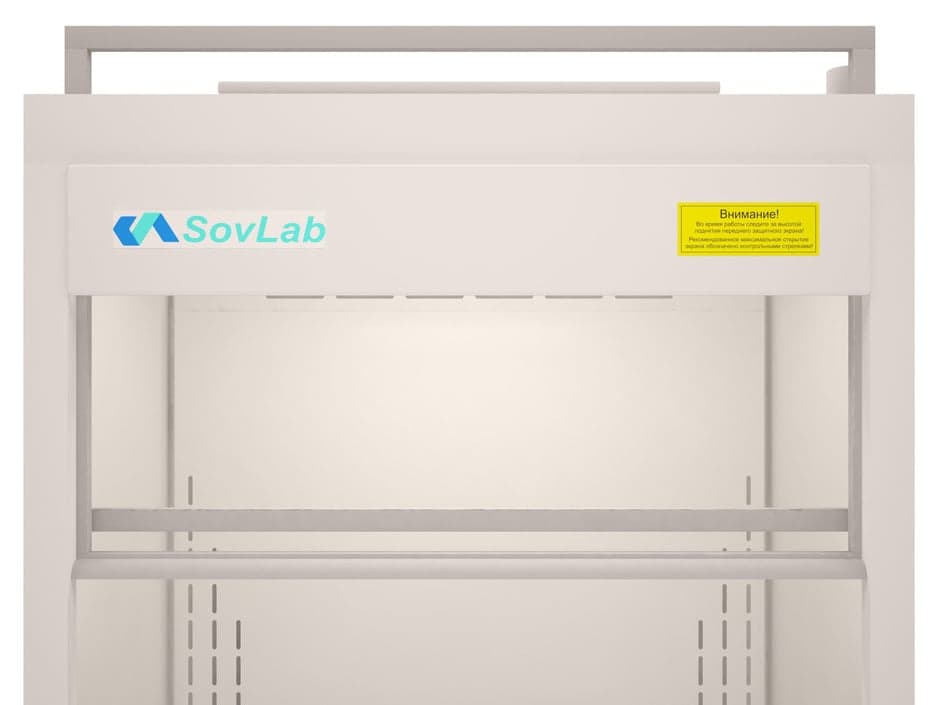 Три уровня вытяжки. Крыша шкафа цельнометаллическая. Передний противопроливочный бортик из нержавеющей стали. Ударопрочный передний экран, стекло триплекс в алюминиевой рамке. Пыле-, влагозащищённый люминесцентный светильник (IP 65 2х18 вт). Светильник изолирован от рабочего бокса защитным стеклом. Фланец для подключения к вытяжной вентиляции 200 мм.